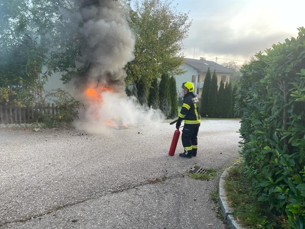 Am Einsatzort stellte sich heraus, dass mitten in einer Siedlung Flammen aus einem Stromverteiler schlugen. Sofort wurde mit dem Eindämmen des Brandes mit Handfeuerlöscher begonnen bzw. umliegende Objekte geschützt. Da der Verteiler zu diesem Zeitpunkt noch unter einer Spannung von 400 Volt stand, entzündeten sich immer wieder neue Flammen. Parallel zur aktiven Brandbekämpfung wurde ein zweifacher Brandschutz aufgebaut und die Einsatzstelle mit Absperrband abgesichert. Erst nachdem der Energieversorger den Verteiler spannungslos geschaltet hat, konnte der Brand endgültig abgelöscht werden.