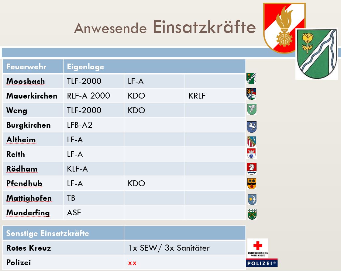 Mit 10 Feuerwehren und 125 Einsatzkräften war dies eine der größten Übungen die in Moosbach je stattfand. Inklusive Statisten, Beobachter usw. waren 195 Personen beteiligt.