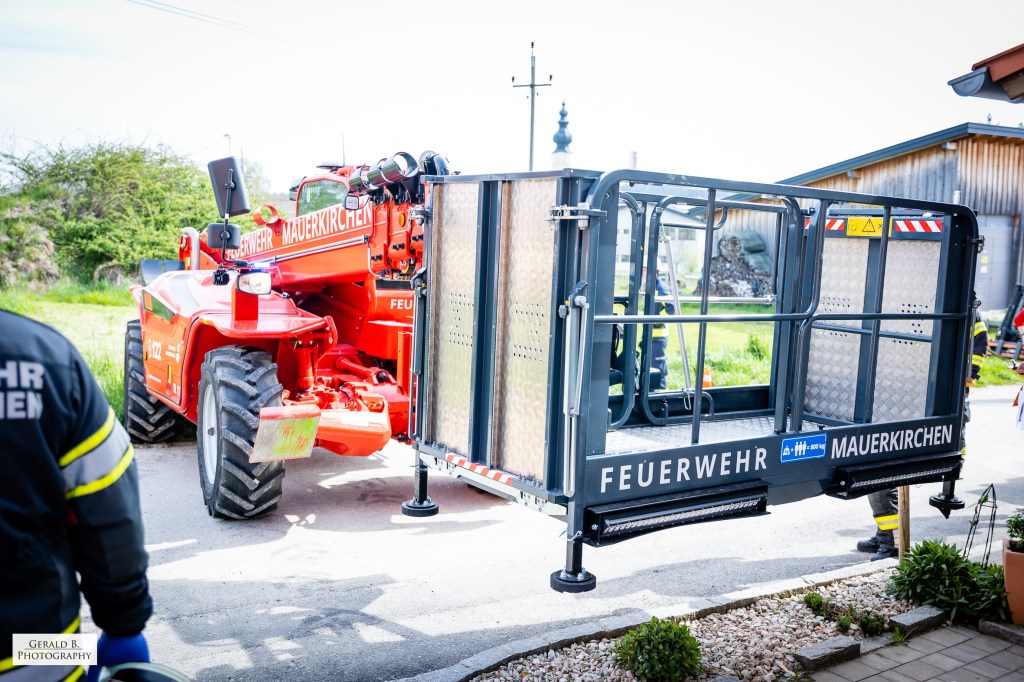 Da der Patient nicht über das enge Stiegenhaus abtransportiert werden konnte, forderte uns der Rettungsdienst an. Um eine möglichst patientenschonende Rettung zu ermöglichen wurde zeitgleich die FF-Mauerkirchen mit ihrem Teleskoplader alarmiert. Der Patient wurde so über die Rettungsbühne innerhalb weniger Minuten aus dem ersten Stock gerettet und dem Rettungsdienst übergeben.
