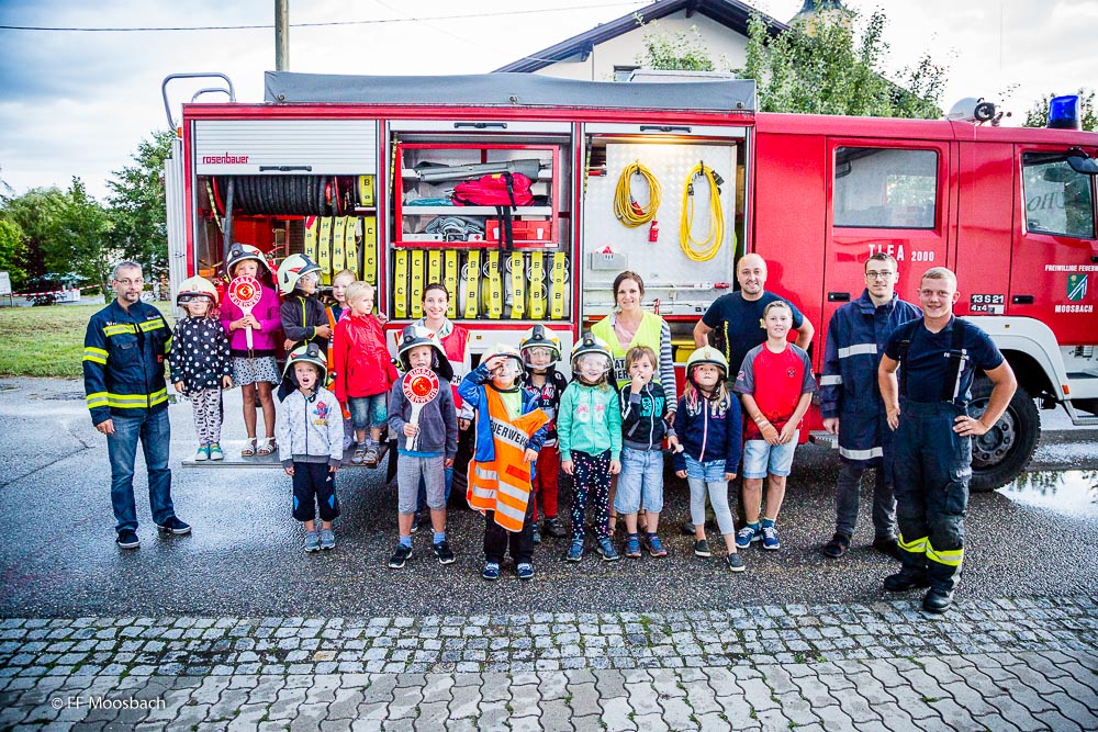 29.Juni 2017 – Kurz vor den Ferien dürfen die Schulanfänger des Kindergarten Moosbach im Kindergarten übernachten. Im Zuge dieser Aktion besuchten uns die Kinder mit ihren Pädagoginnen Verena und Anna im Feuerwehrhaus. Bei der Frage wer aller eine Runde durch Moosbach mit den beiden Feuerwehrautos mitfahren möchte, zeigten natürlich alle Kinder auf, ausgerüstet mit Helmen ging es los. Zum Abschluss gab es noch Süßigkeiten und eine Limonade.