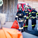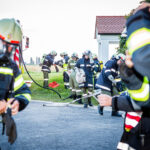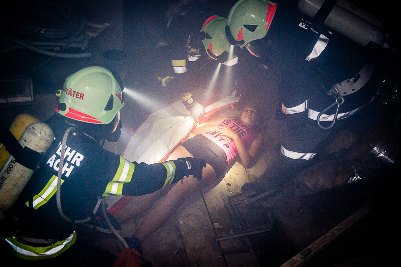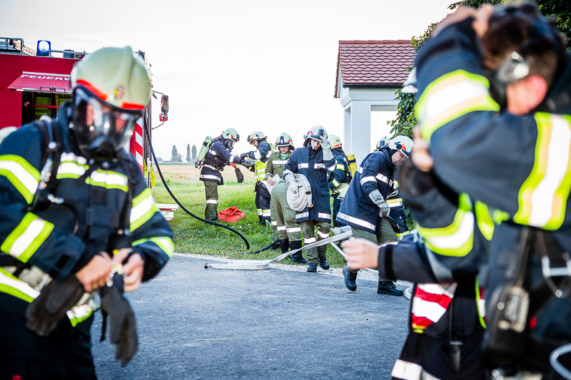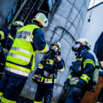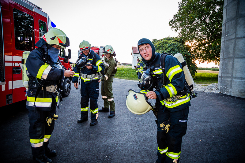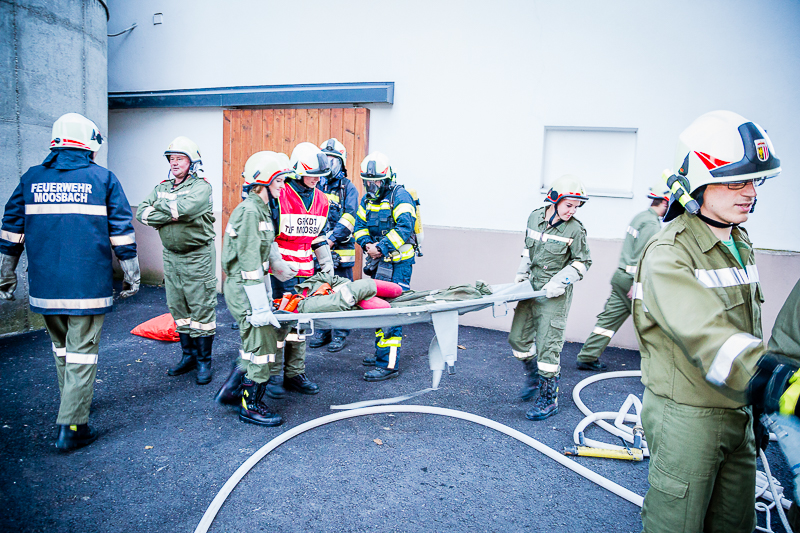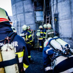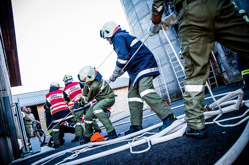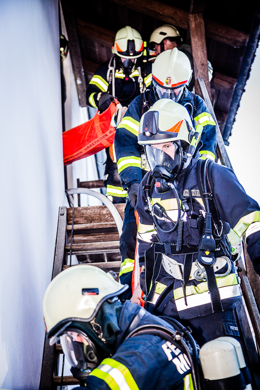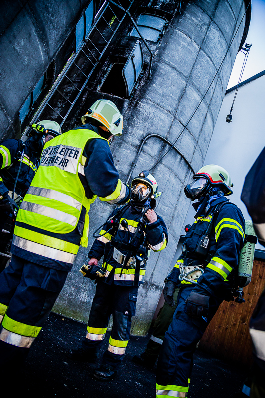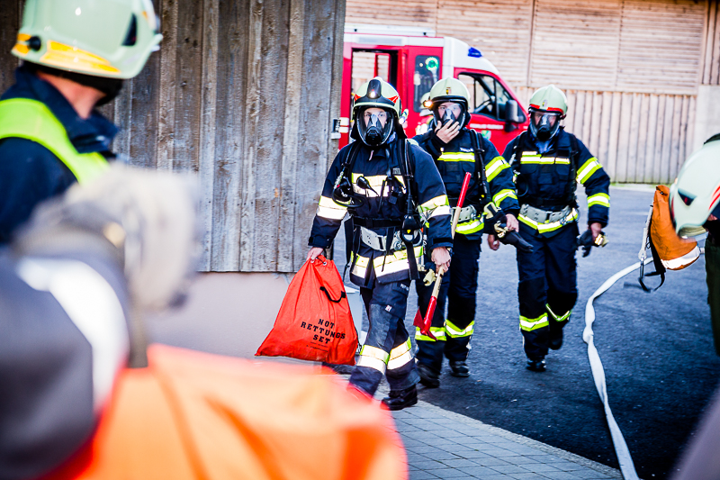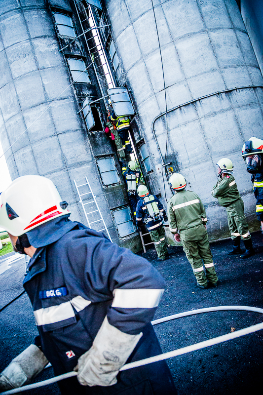 Bereits bei der Anfahrt zum Objekt wurden 2 Trupps mit schwerem Atemschutz ausgestattet. Nach Erkundung der Lage wurde der erste Atemschutztrupp mit der Suche und der anschließenden Rettung der beiden vermissten Kinder im 1. Stock des landwirtschaftlichen Objekts beauftragt, in kürzester Zeit konnten die beiden vermissten Kinder gefunden und mit Hilfe des 2. Atemschutztrupps aus dem stark verrauchten Objekt gerettet werden, während die Kinder Erstversorgt wurden, bereitete die restliche Mannschaft die Rettung der bewusstlosen Person aus dem Silo vor. Da die Person ca. 4-5 Meter tief unten lag musste der Atemschutztrupp mit Hilfe einer Rettungsleine zur abgestürzten Person (Puppe ca.85kg) abgeseilt werden. Nachdem 2 Atemschutzträger abgeseilt wurden konnte die Person mithilfe eines 5-Punkt Sicherheitsgeschirrs und der Rettungsleine herausgehoben werden.