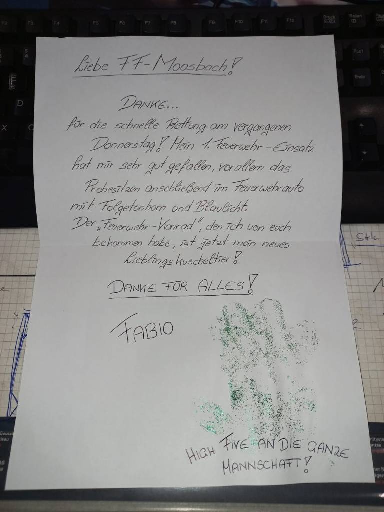 Wir sagen auch danke, dass du so tapfer bei deinem ersten Feuerwehreinsatz warst und für diesen lieben Brief.